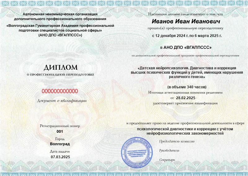 Обучение по такой программе – способ освоить новую профессию на основе ранее полученного образования. В дипломе выпускника указывается его ФИО, наименование учебной организации, название и длительность программы. Документ заверяется подписью руководителя и печатью АНО ДПО «ВГАППССС».