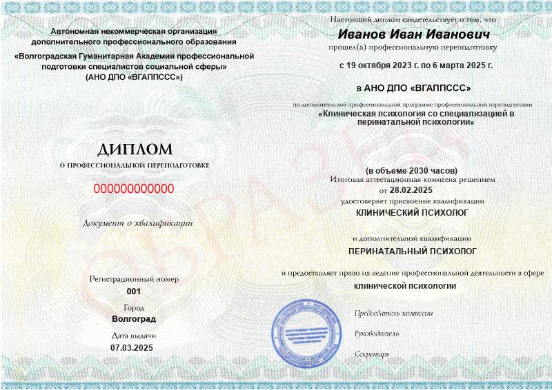 Обучение по такой программе – способ освоить новую профессию на основе ранее полученного образования. В дипломе выпускника указывается его ФИО, наименование учебной организации, название и длительность программы. Документ заверяется подписью руководителя и печатью АНО ДПО «ВГАППССС».