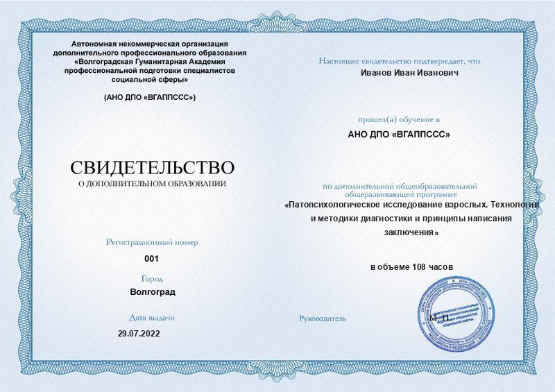 Заполненные образцы документов можно найти в описании конкретных образовательных программ на сайте АНО ДПО «ВГАППССС», а также на странице «Лицензия. Документы».