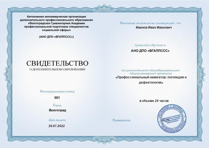 Выдаваемый документ: Свидетельство о дополнительном образовании